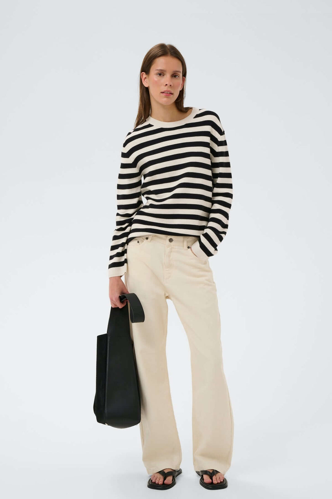 Jean Tia court à jambes larges, pantalon à taille haute et coupe droite en tissu clair, porté avec bottines marron et pull rayé.