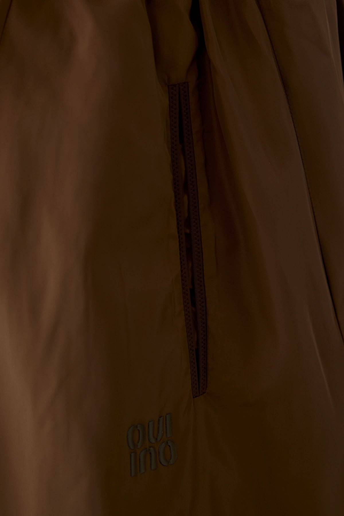 Détail sur le tissu marron de la jupe midi fluide avec poche latérale et logo cousu.