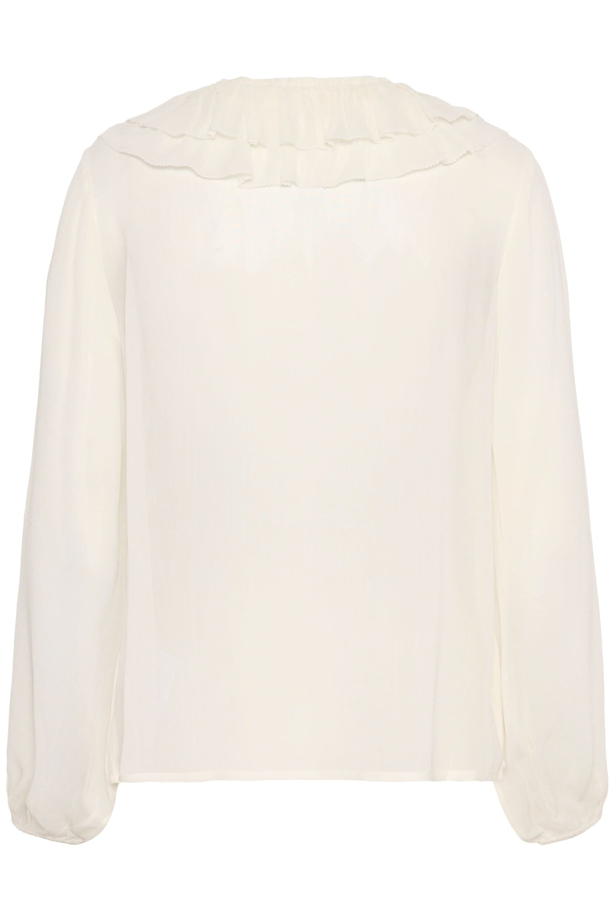 Description: Cette blouse fluide séduit par son élégance romantique grâce à son col orné de volants délicats. Sa matière légère et transparente offre un tombé raffiné et féminin. Conseil style : portez-la rentrée dans un pantalon tailleur ou une jupe midi pour un look chic et sophistiqué.