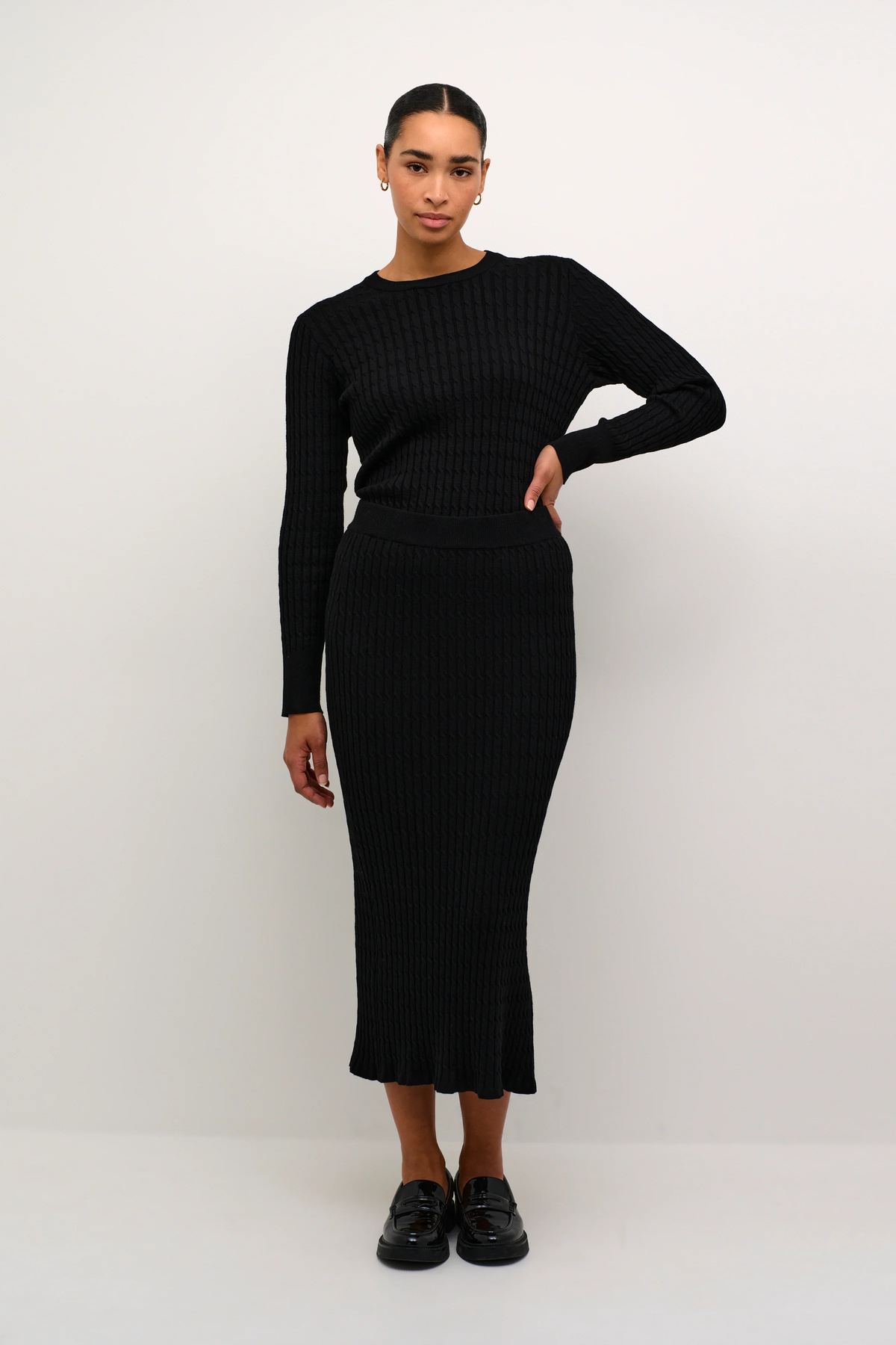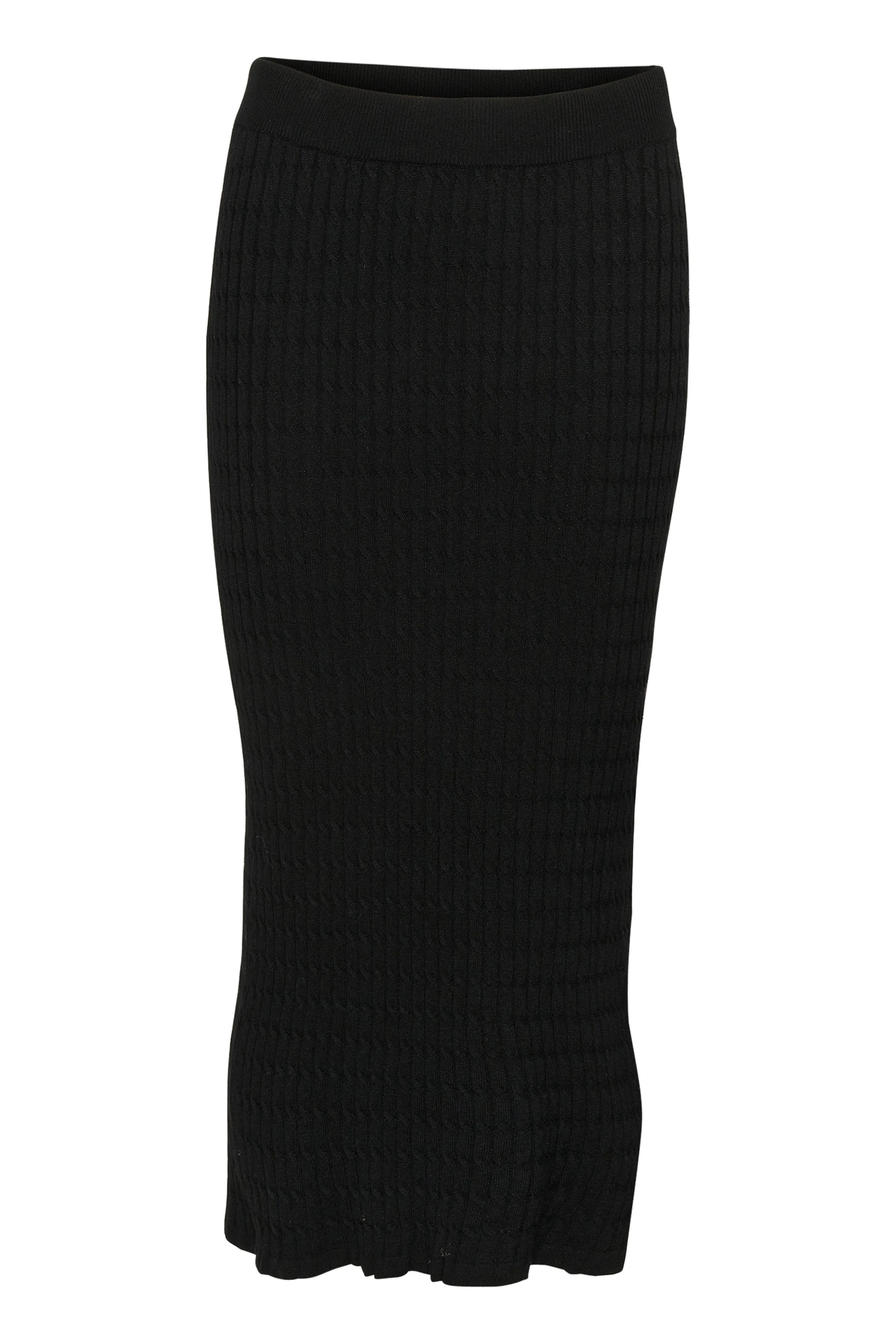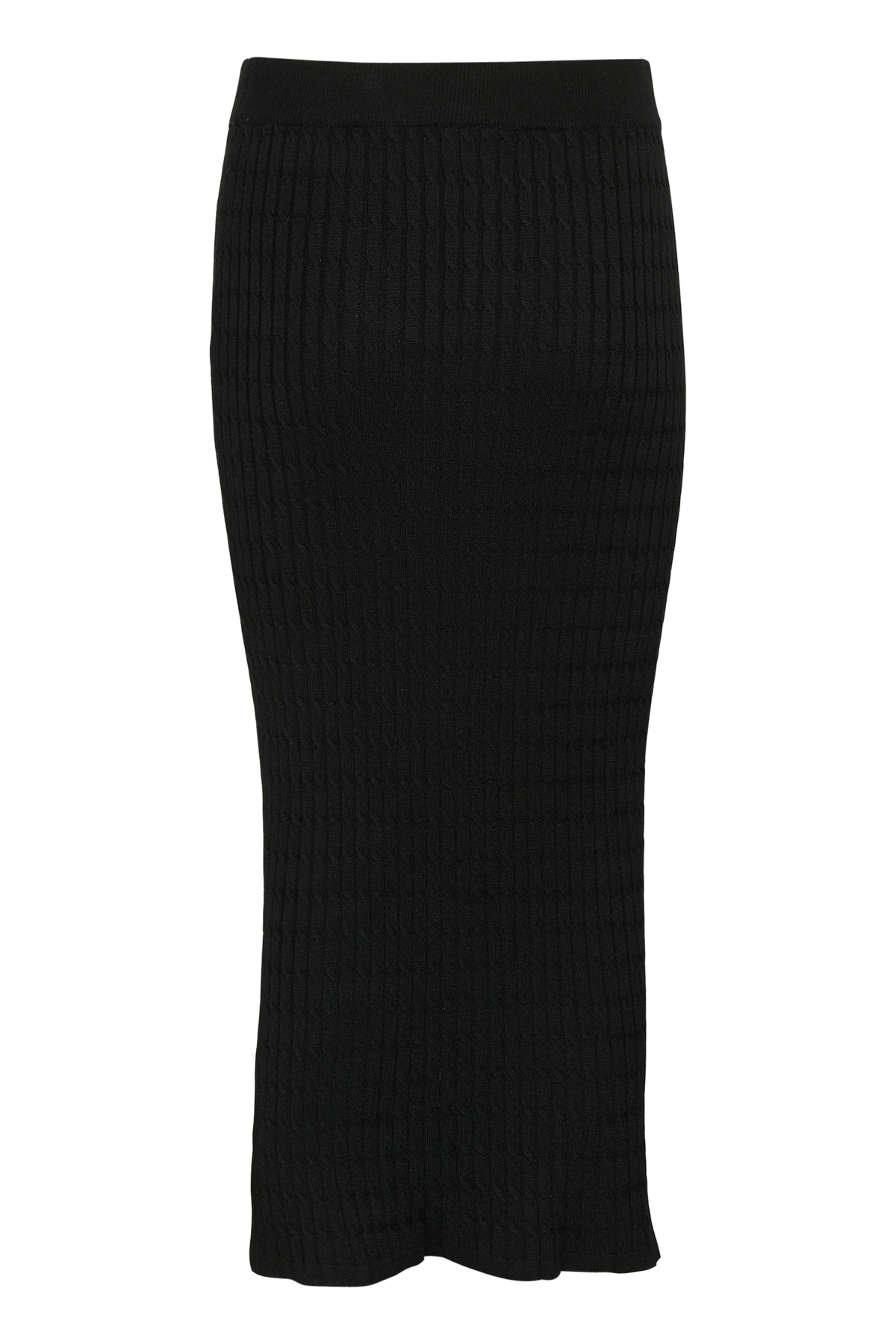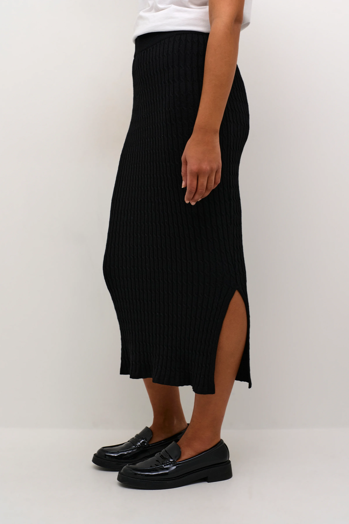 Jupe longue noire avec texture côtelée et fente sur le côté, élégante et confortable pour toutes occasions.
