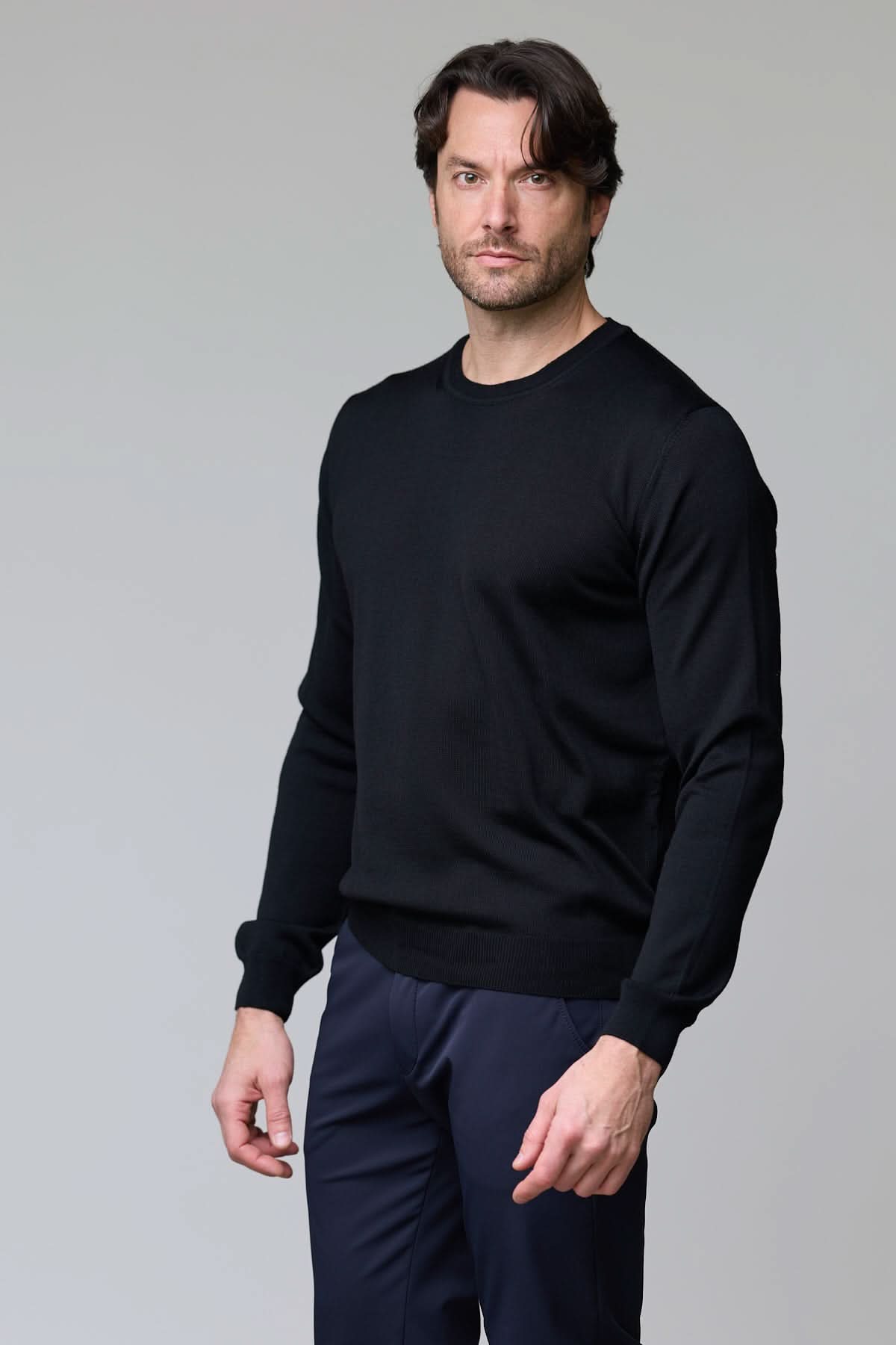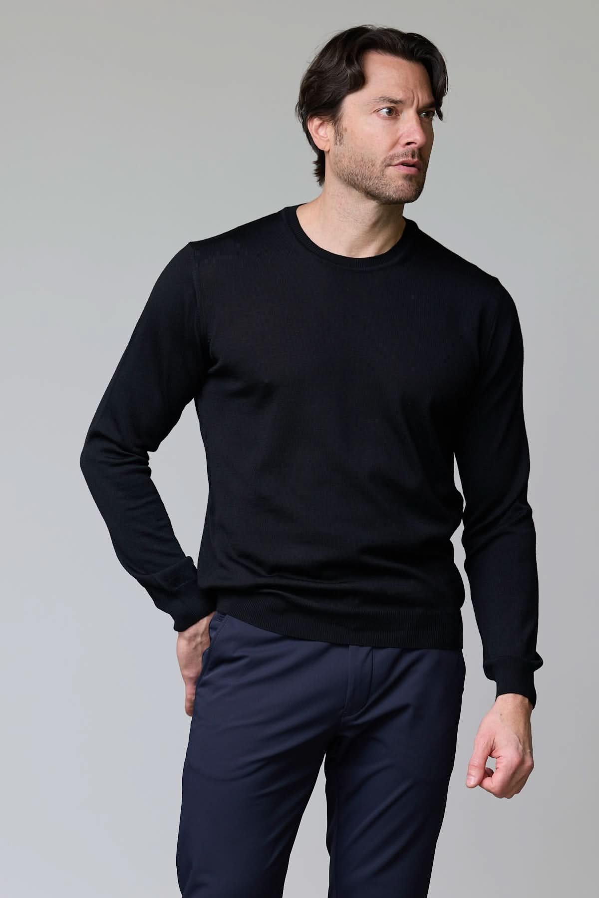 Ce chandail à col rond en laine mérinos offre une allure élégante et décontractée. Sa maille fine procure un confort exceptionnel et une chaleur naturelle idéale pour la saison. Polyvalent, il se porte aussi bien seul qu’en superposition sous un veston.