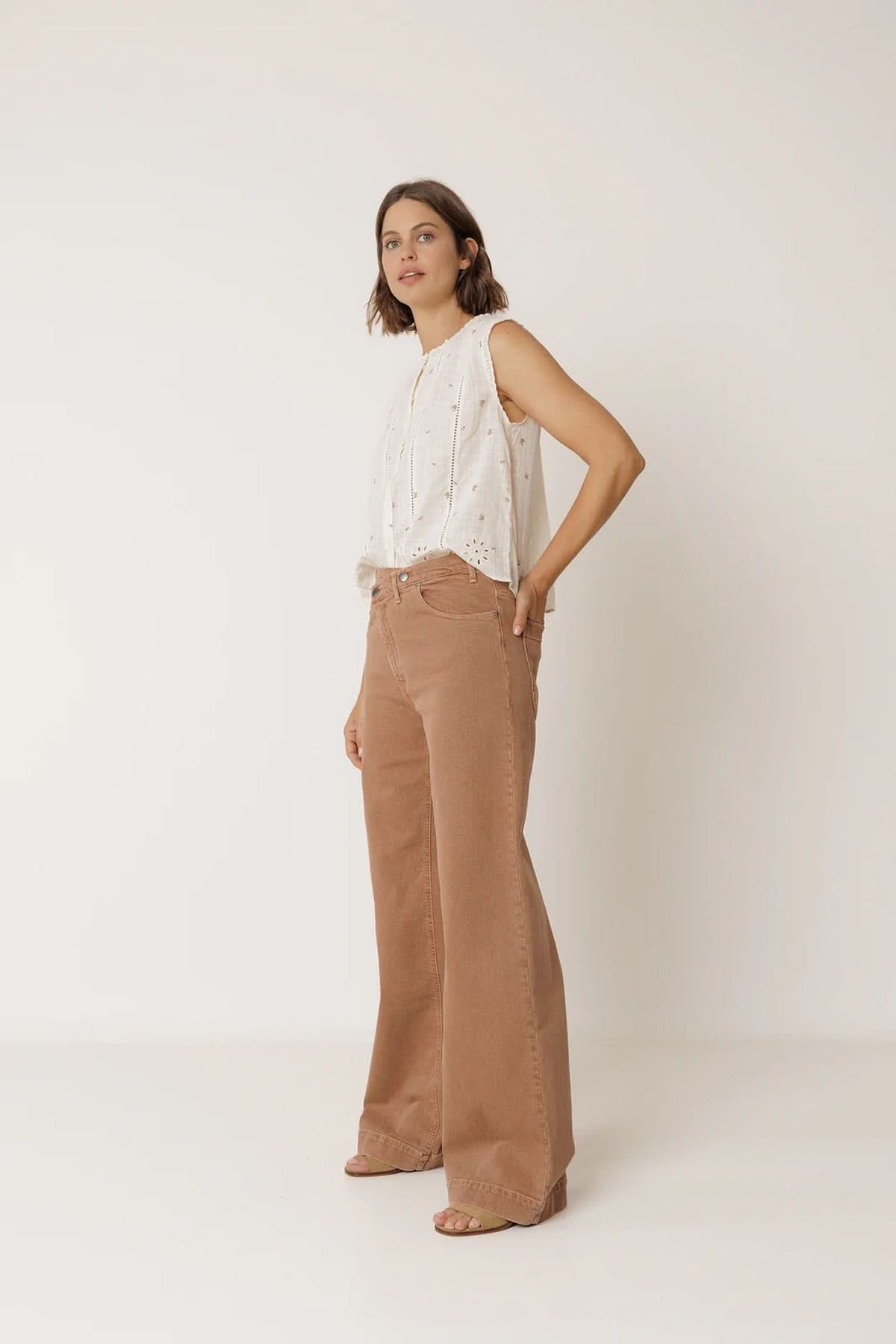 This sleeveless blouse charms with its delicate look and refined finishes. Its round neckline is highlighted by a scalloped edge that adds a subtle romantic touch. The vertical openwork bands structure the silhouette while hinting at a light and airy texture. Its discreet pattern completes the look with elegance, perfect for a feminine and luminous outfit.