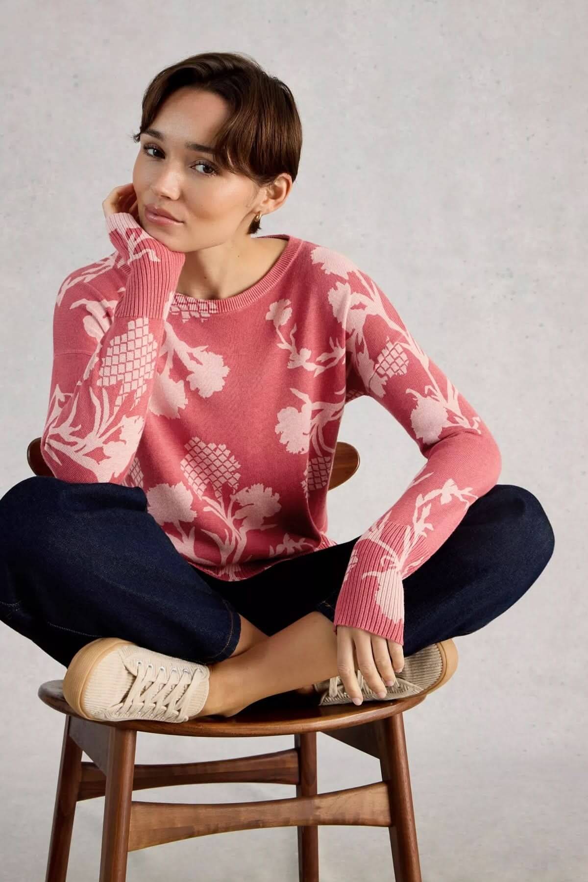 Chandail imprimé à manches longues Olive avec maille douce et imprimé graphique rose, idéal pour un style décontracté féminin.