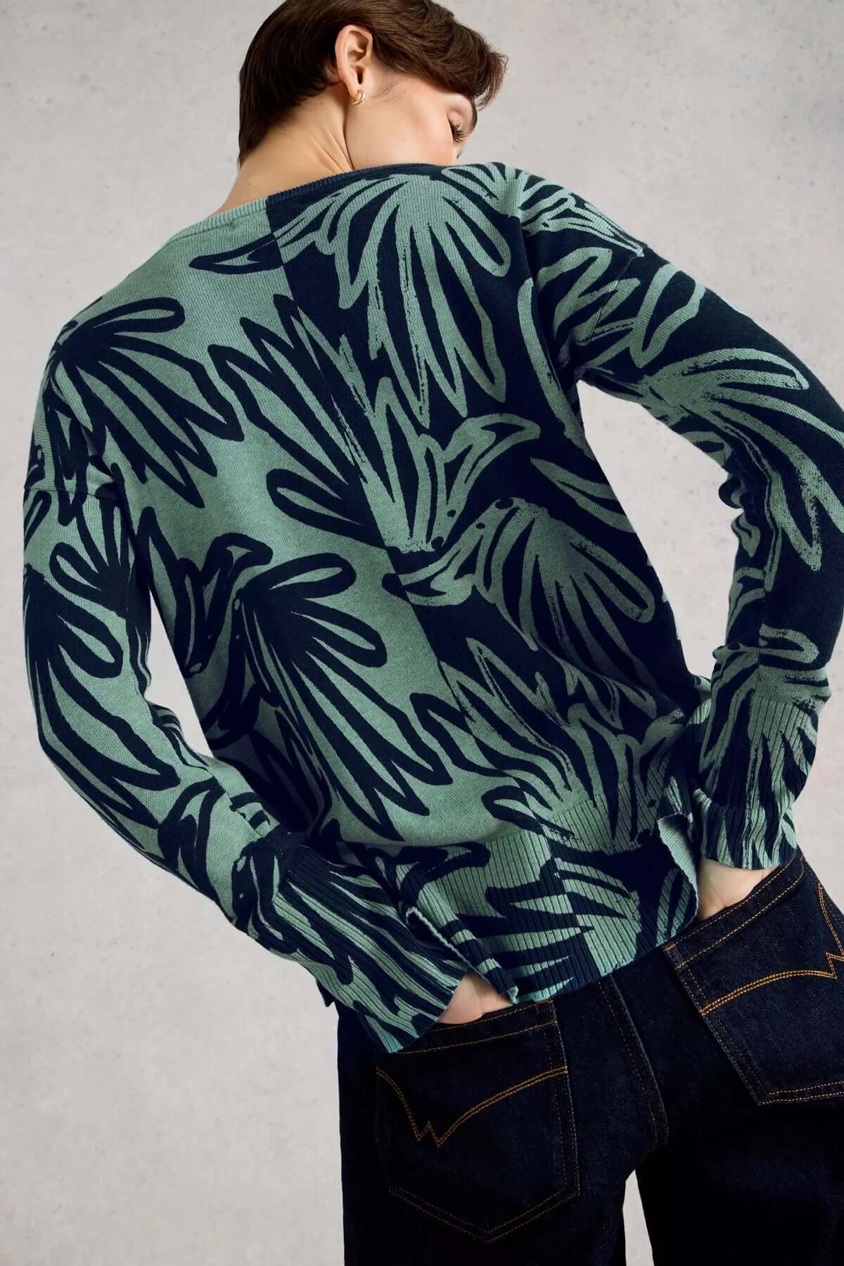This printed sweater offers a comfortable, feminine silhouette, ideal for a casual yet polished look. Its soft knit fabric is comfortable to wear, while the print adds a subtle graphic touch. Easy to style, it can be worn with jeans or more structured pants.