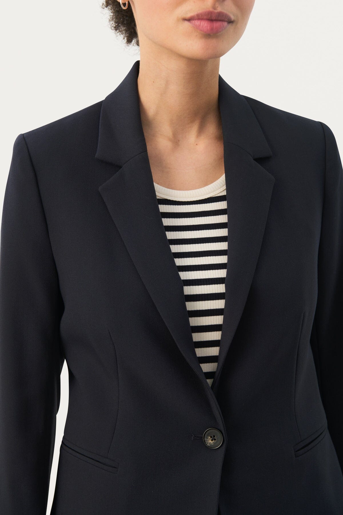 Description : Classic Taylor jacket, slightly fitted, single-breasted, high collar, long sleeves, satin lining. Its fall on the hips adds a touch of elegance. It combines effortlessly to your outfits for a chic or casual look whether for work or the weekend.