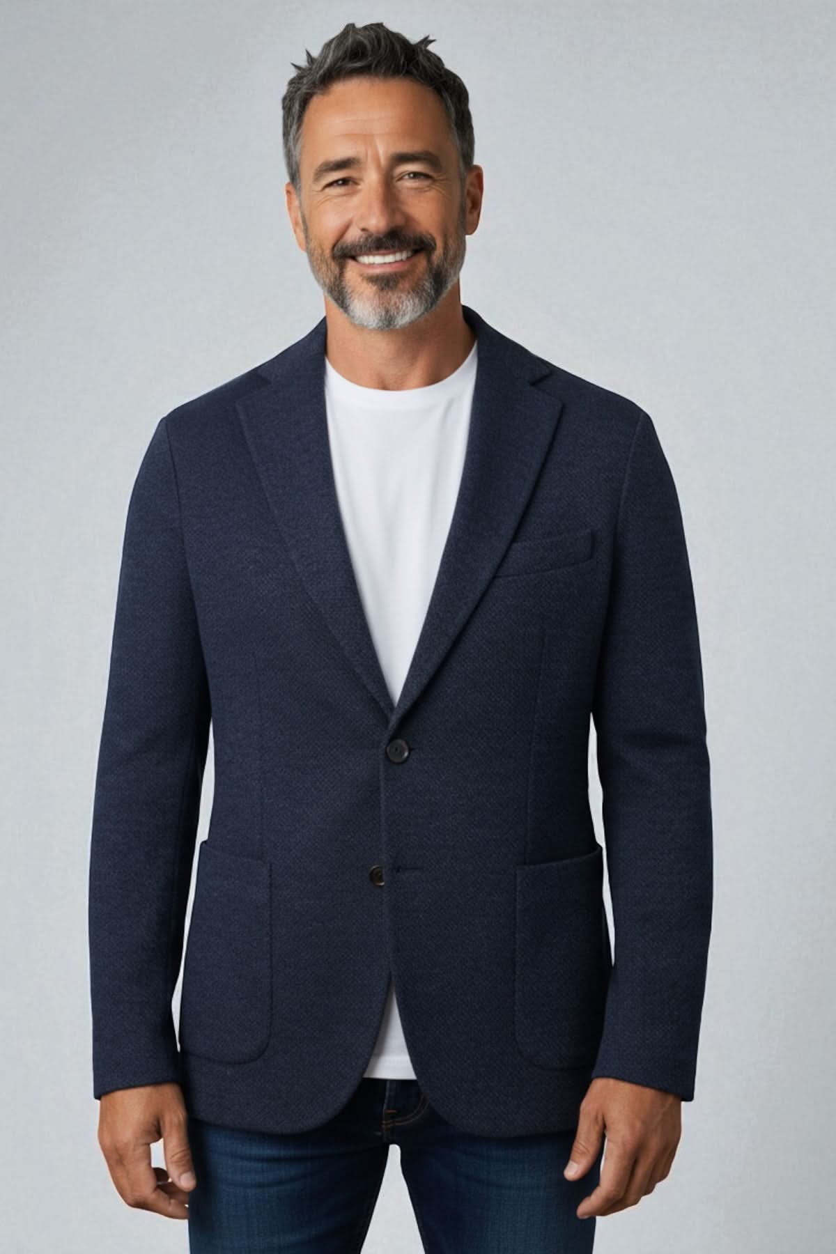 Description: This unstructured blazer in navy blue cotton jersey embodies Circolo 1901's signature casual elegance. Its subtle texture adds depth and character, while the fabric's suppleness ensures exceptional comfort. With its modern lines and minimalist finishes, it can be worn with dress pants or jeans for a versatile look.