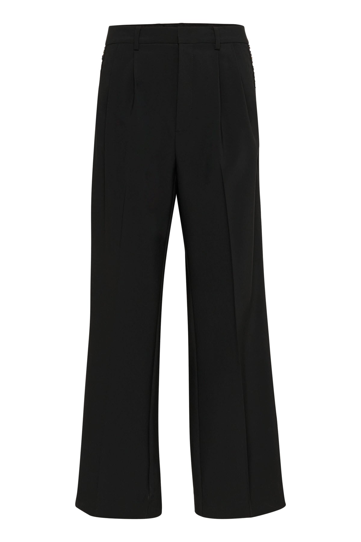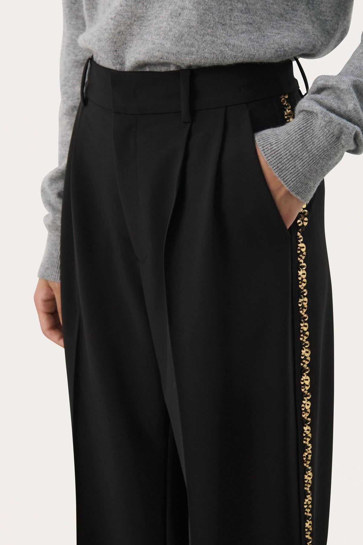 Description : Ce pantalon noir large et élégant se distingue par une bande décorative brodée dorée qui longe chaque côté, ajoutant une touche de sophistication et de glamour à une pièce classique. La taille haute et les plis subtils à l’avant confèrent une silhouette allongée et structurée, tout en restant confortable et fluide. Ce pantalon est parfait pour un look raffiné et formel ou pour apporter une note chic à une tenue plus décontractée.