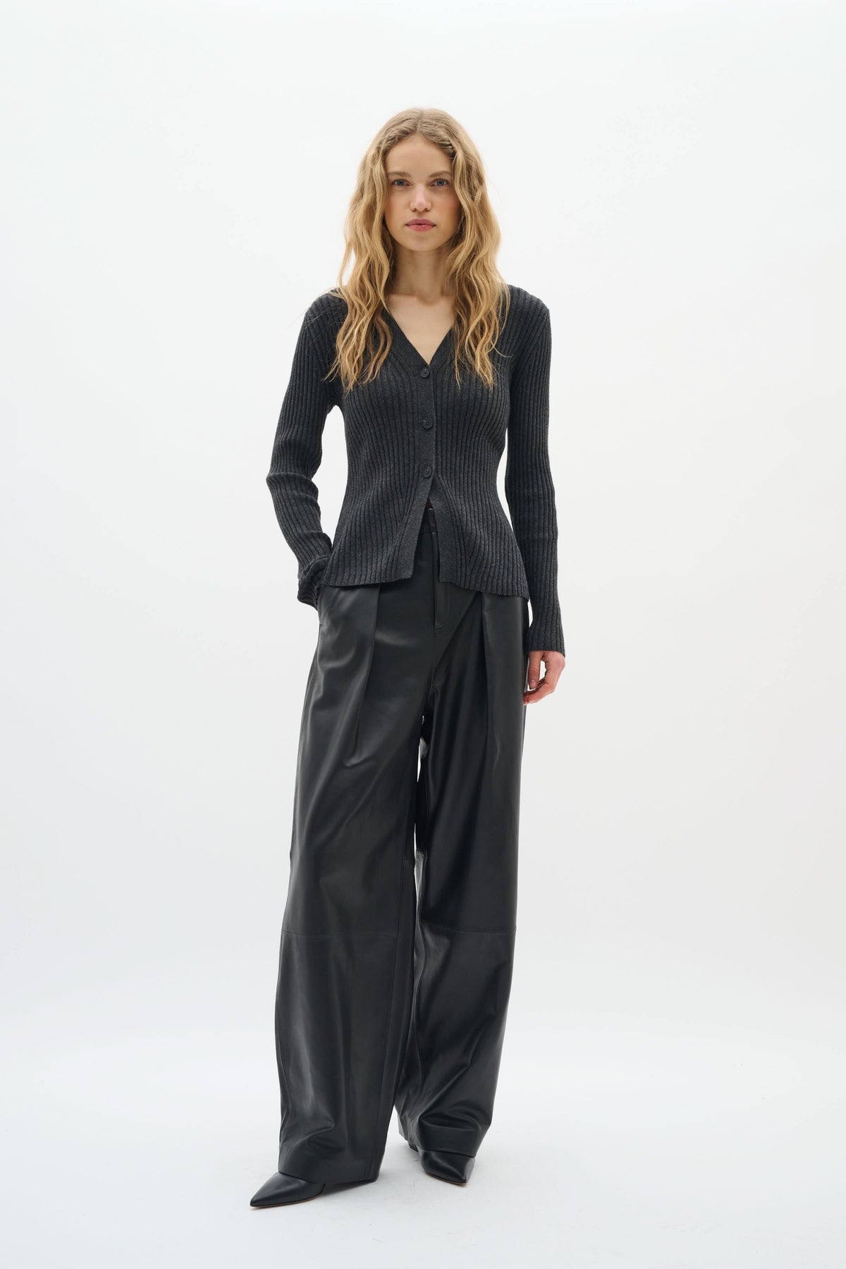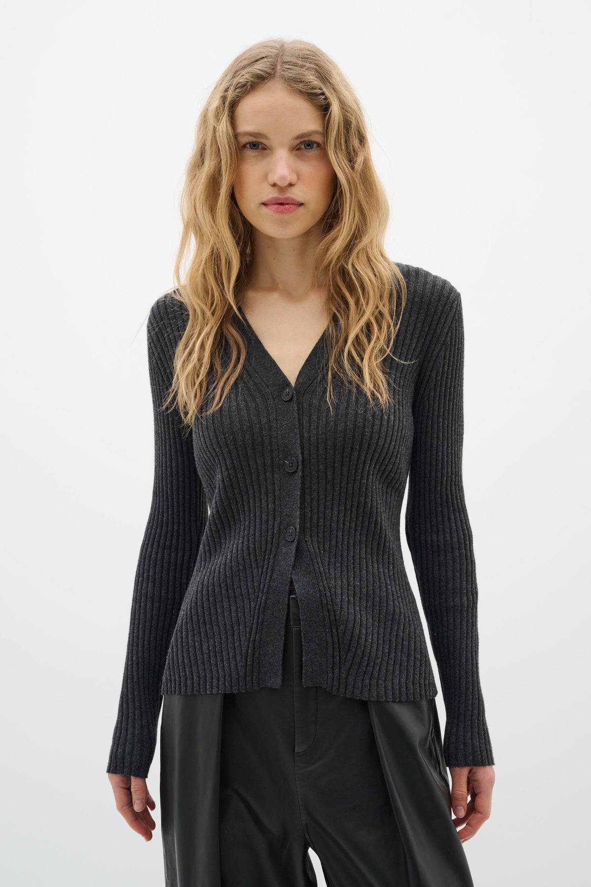 Description: Ce cardigan à côtes fines et coupe ajustée apporte une touche élégante et féminine à vos tenues. Son encolure en V et sa fermeture boutonnée en font une pièce polyvalente à porter seule ou superposée sur un top léger. Conseil style : associez-le à un pantalon fluide ou une jupe pour un look chic et confortable.