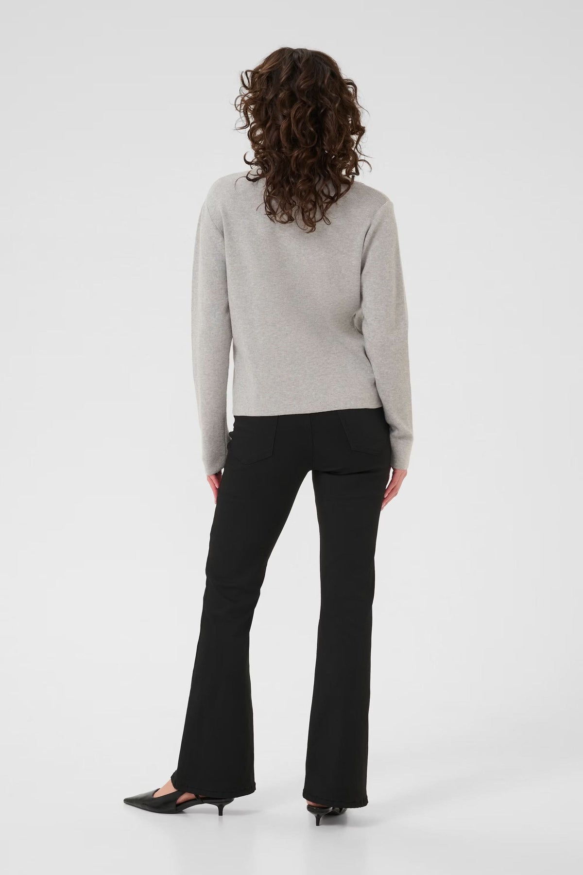 Femme portant un cardigan Visja zippé gris avec col chemise, vu de dos, style minimaliste et moderne, associé à un pantalon noir.