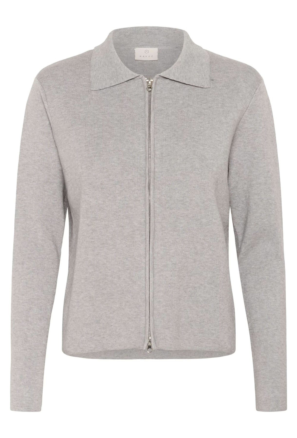 Cardigan Visja zippé en maille fine grise avec col chemise, style minimaliste et moderne pour une allure élégante et décontractée.