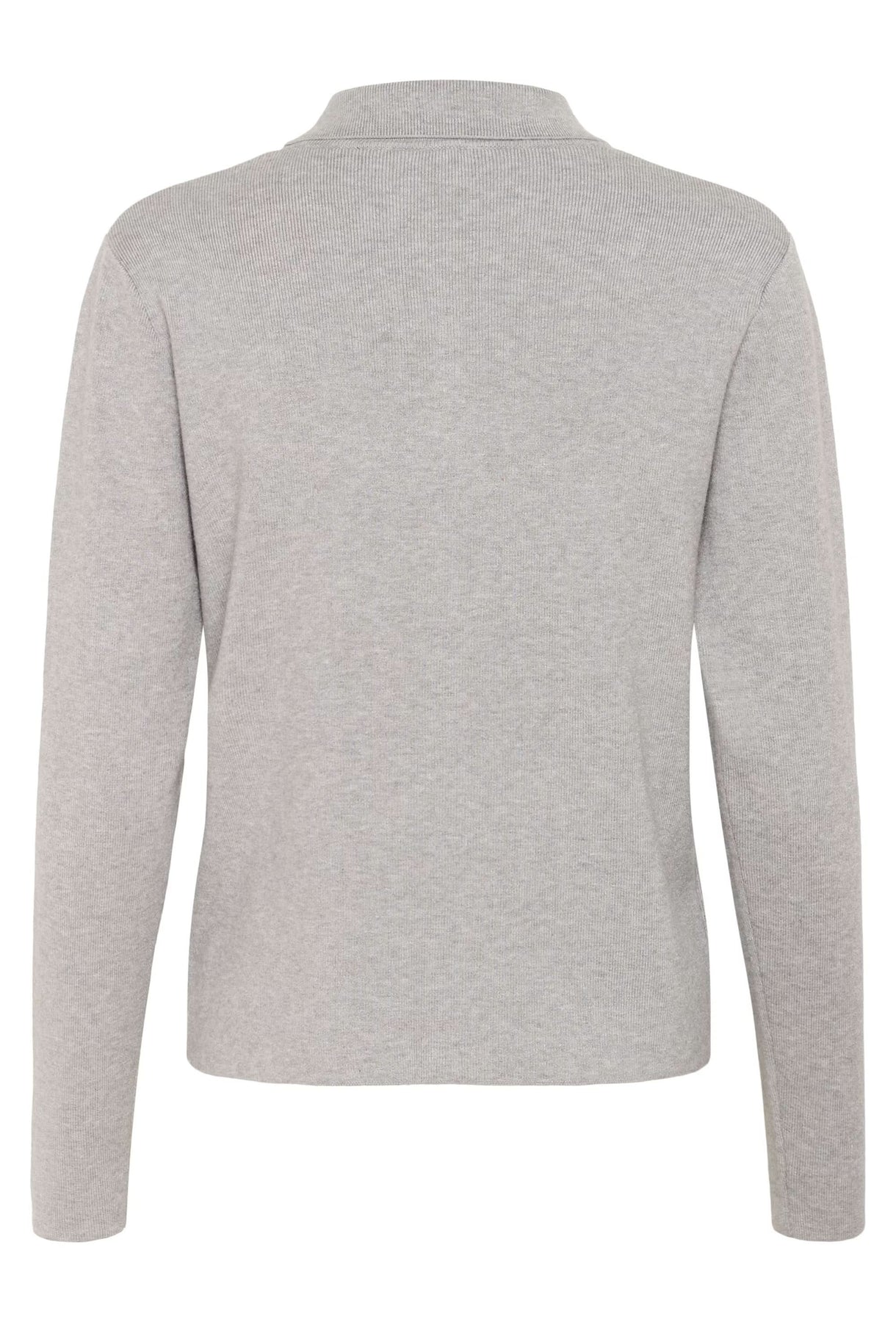 Cardigan Visja à col chemise et fermeture zippée, allure minimaliste et moderne, vue arrière en maille fine grise pour un style élégant.