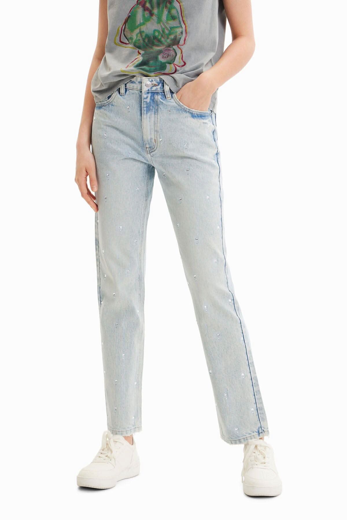 DESCRIPTION: Jean taille mi-haute, coupe droite, jambes légèrement cintrées, dans un tissu légèrement extensible. Orné d'un appliqué en strass et d'une fente sur l'ourlet.