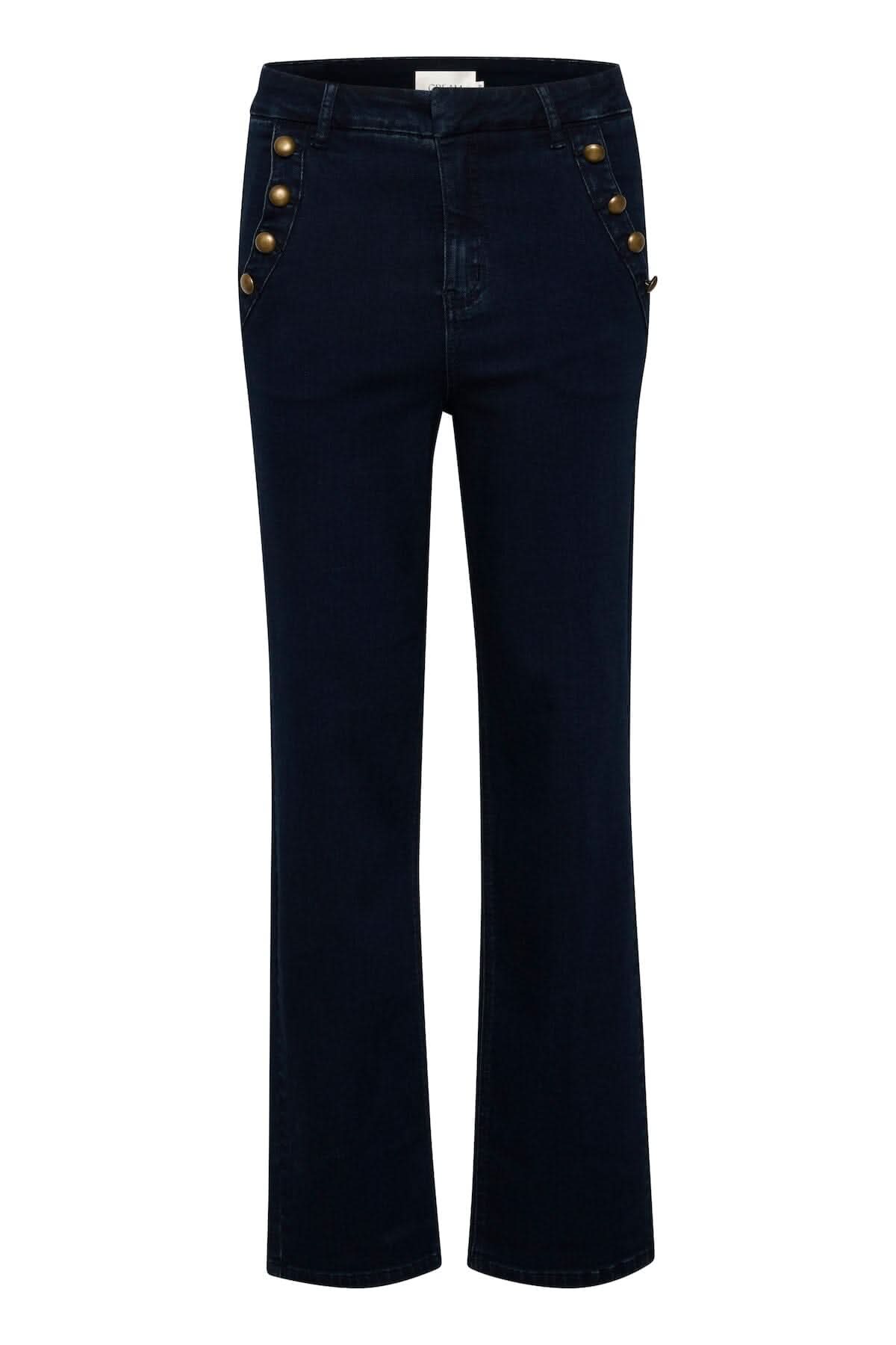 DESCRIPTION: Ce jean comporte une coupe ajustée jusqu'aux genoux et un peu plus ample au niveau des chevilles. Il a 4 poches, deux à l'avant ainis que deux à l'arrière. Il comporte un détail de 4 boutons le long des poches à l'avant. Portez-le avec un jaut blanc ample.