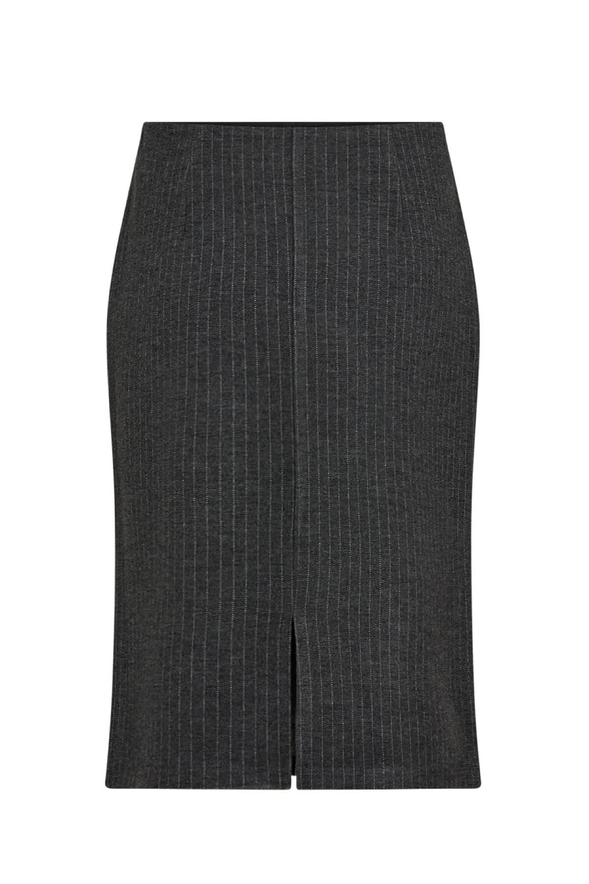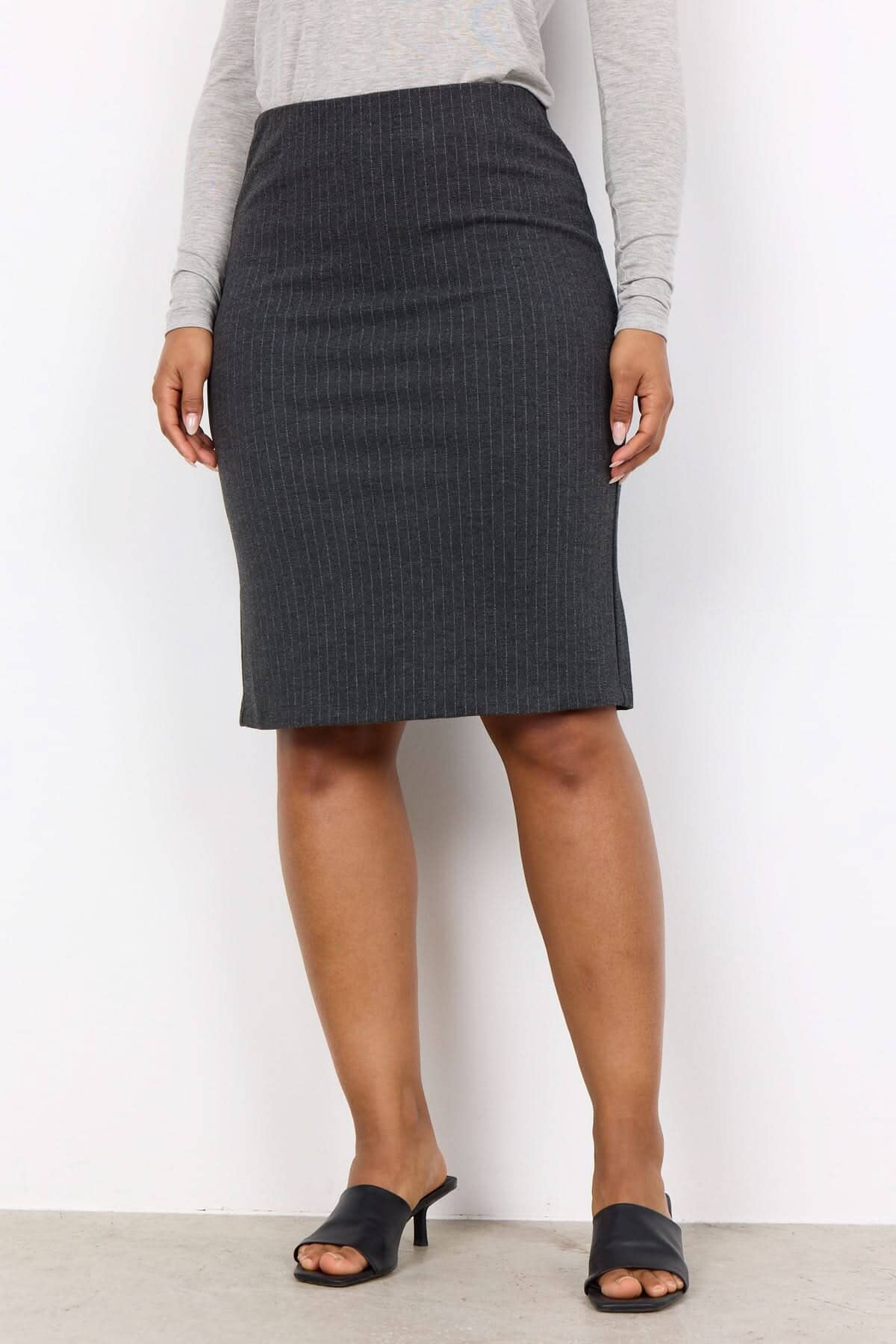 Description : Cette jupe de forme crayon est un classique est idéale dans une tenue professionnelle. La jupe a une taille haute, une longueur aux genoux, une taille élastique enrobée, une fente à l'arrière. Malgré sa teinte unie, elle présente un certain cachet grâce à sa fine rayure. Portez-le avec une chemise oversize et des bottes pour un look sophistiqué.