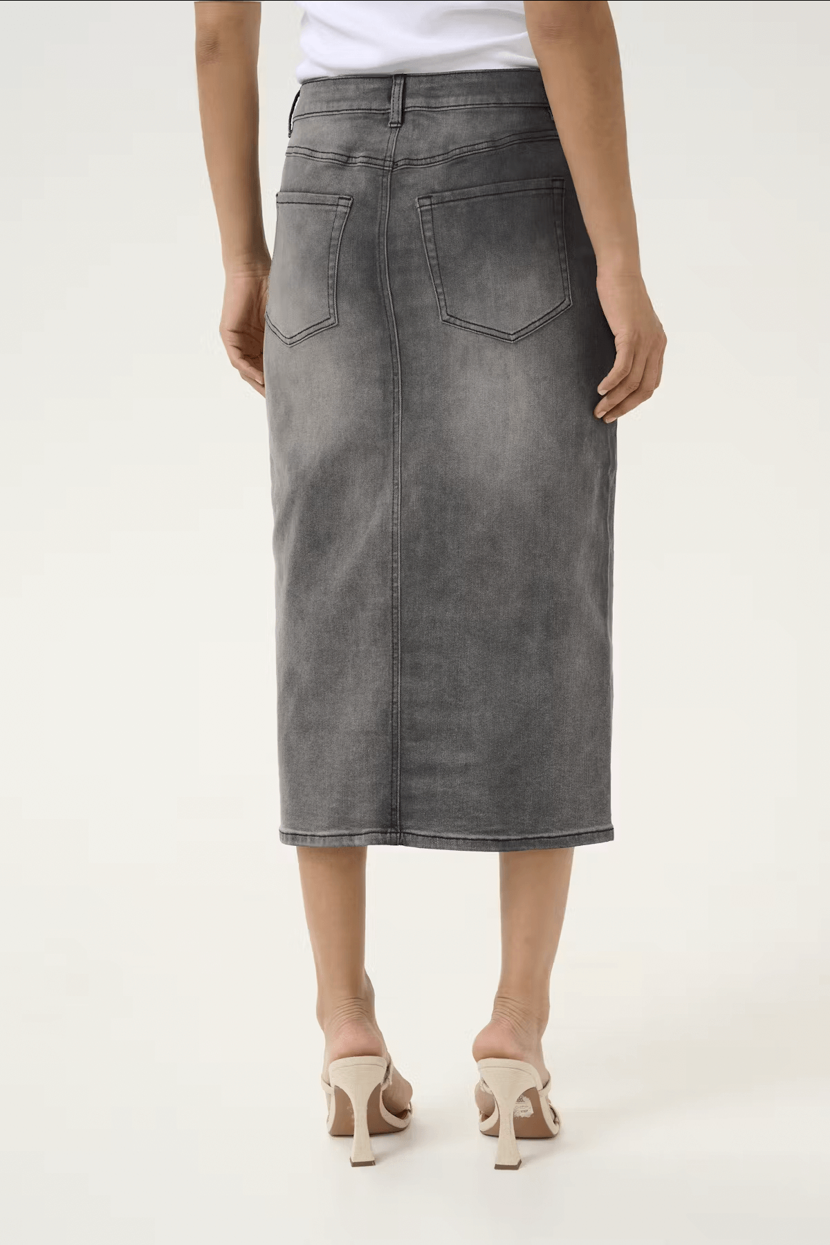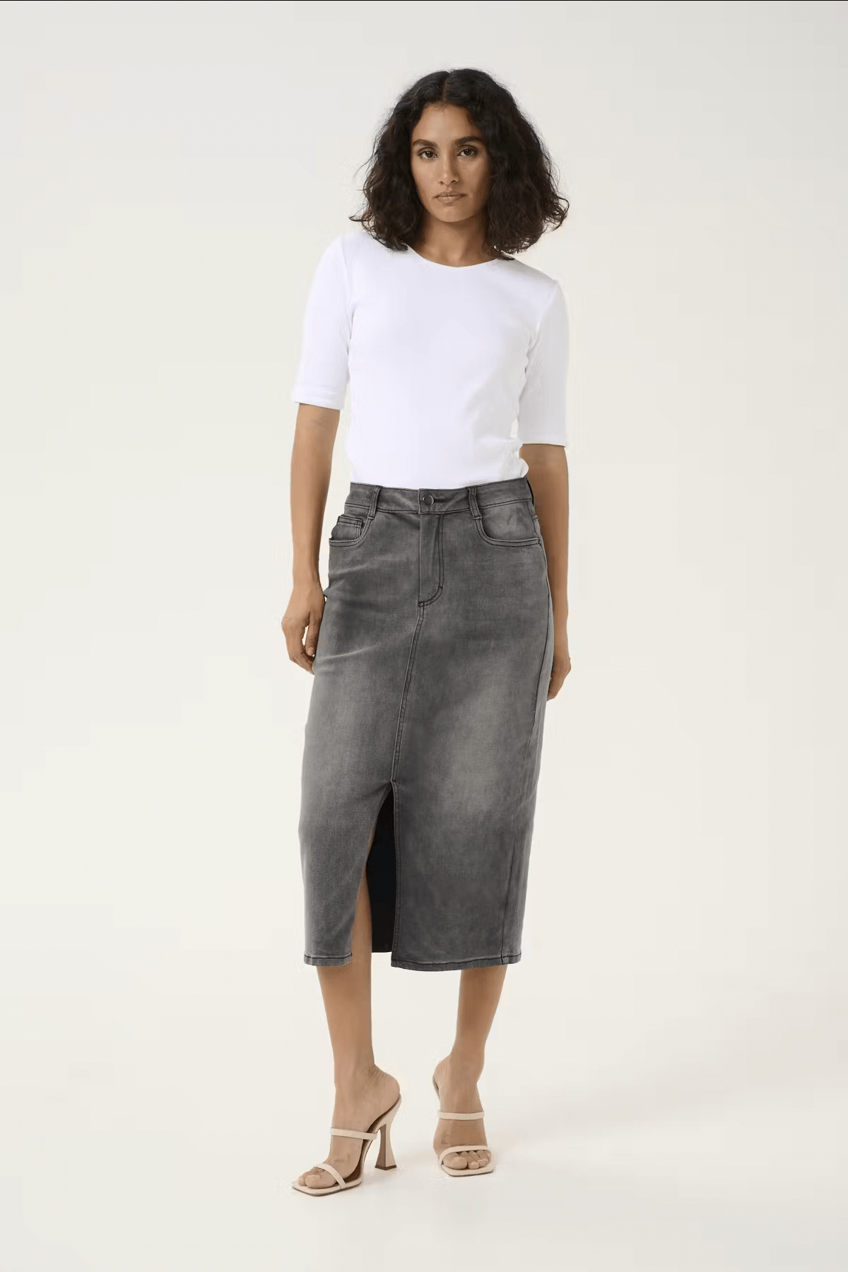 Jupe longue Sinem en denim gris avec fente à l'avant, portée avec un haut blanc et des sandales à talons.