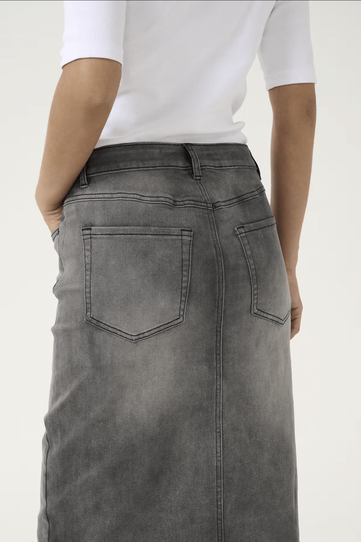 Vue arrière d'une jupe longue grise en denim, taille haute avec poches, mise en valeur d'un style élégant.