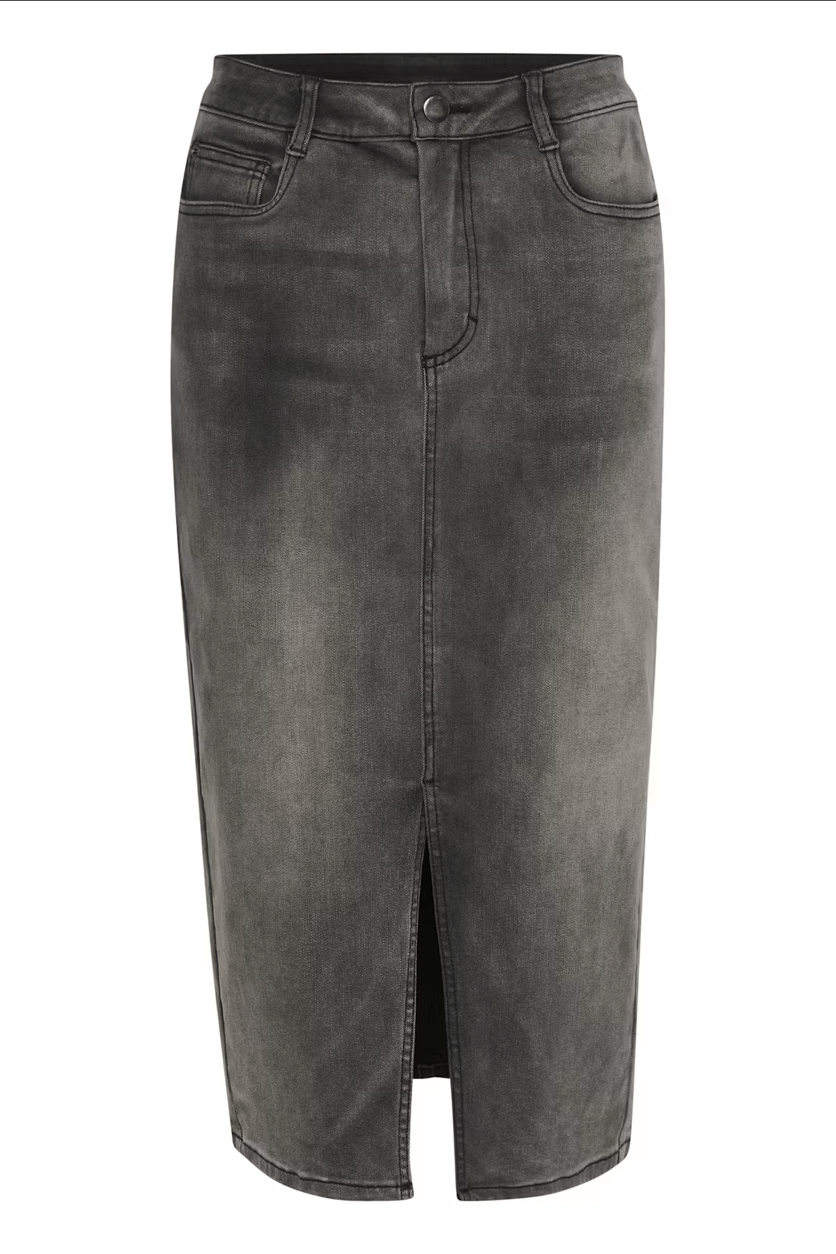 Jupe midi longue en denim gris avec fente avant, élégante et féminine, à porter avec divers styles.