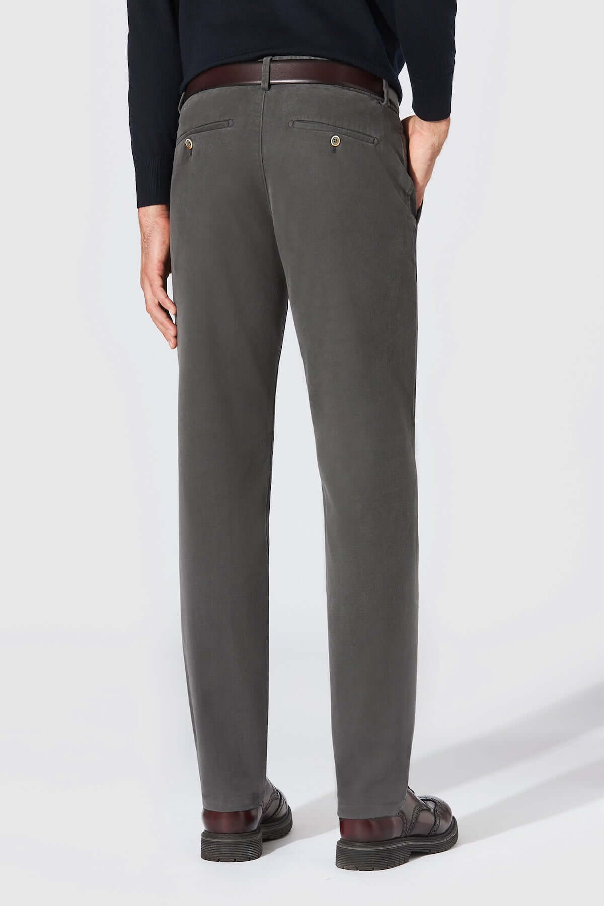 Homme portant le Pantalon Chino Trento en sergé de coton gris avec chaussures marron, illustrant l'élégance décontractée et le confort.