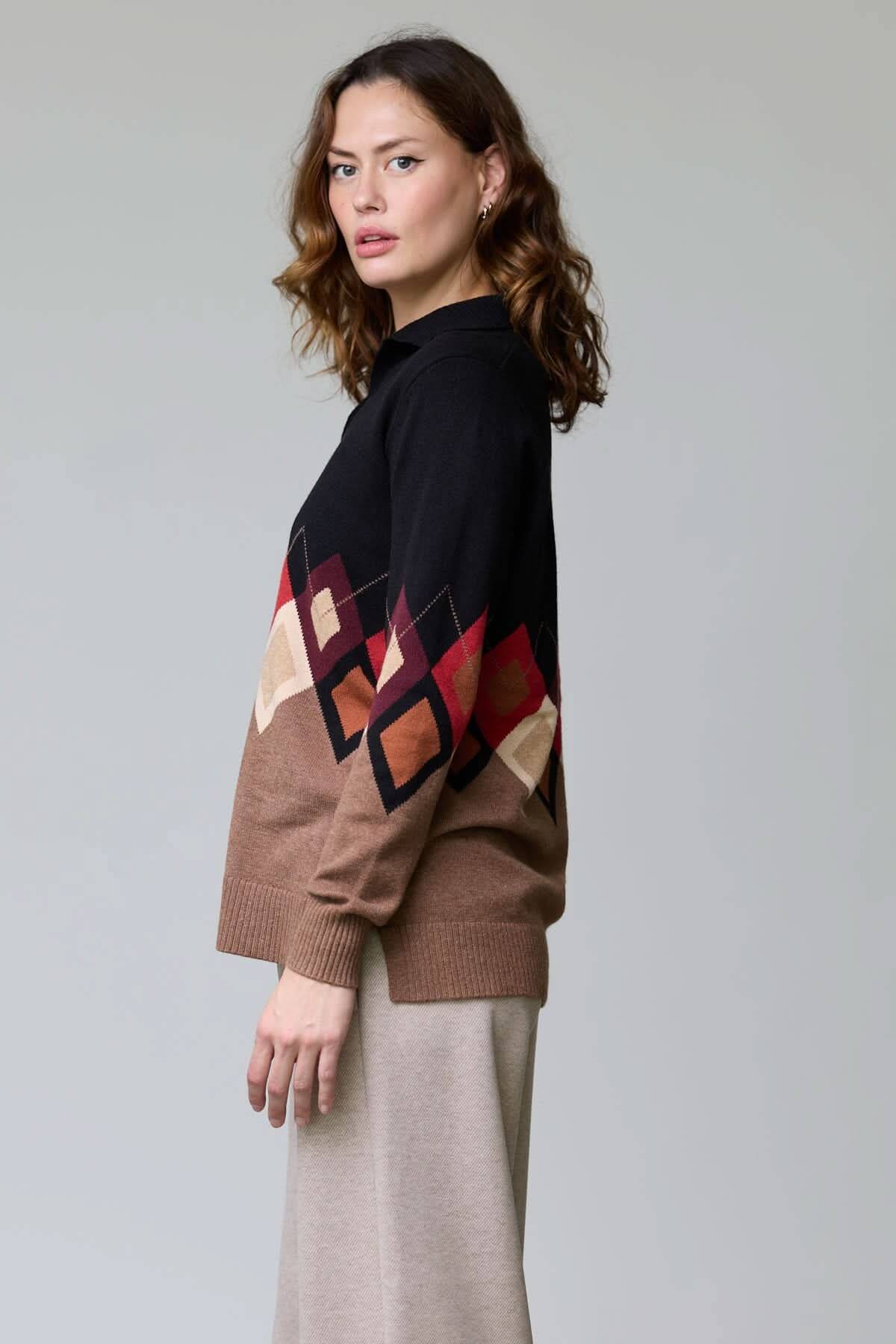 Femme portant un chandail à motif losanges multicolores avec col ouvert et manches longues, style décontracté.